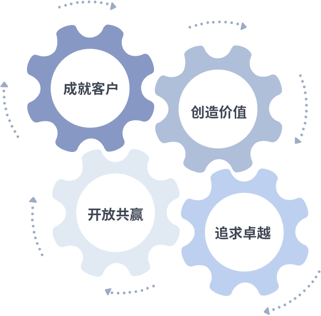 成就客户是一切决策的出发点,,,创造价值是衡量所有工作的标准,,追求卓越是我们做事做人的态度,,,,开放共赢是我们的格局也是最终的结果。。。。价值观的齿轮环环相扣,,,推动着组织里的每个人不断向前。。。。